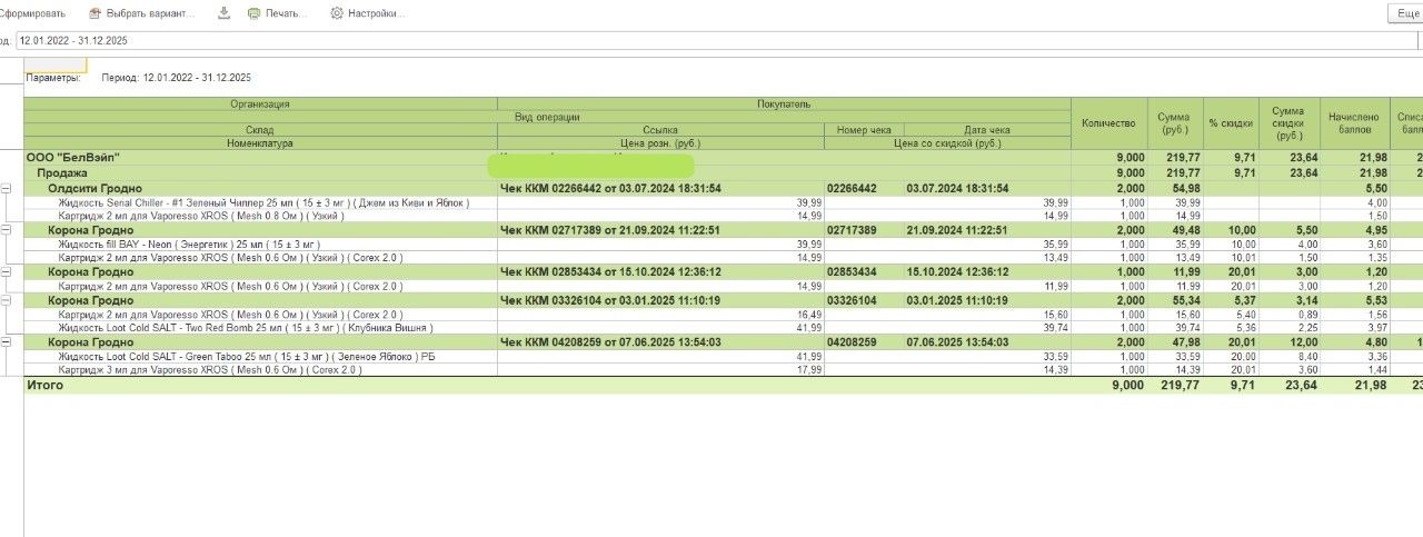 3. Видим историю покупок Клиента по всей сети