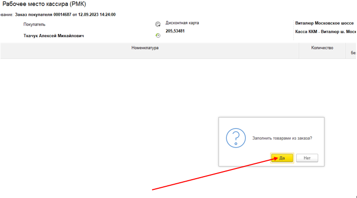 7. Двойным кликом мышки переносим заказ в РМК и подтверждаем Заполнение товарами из заказа