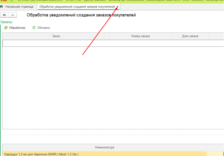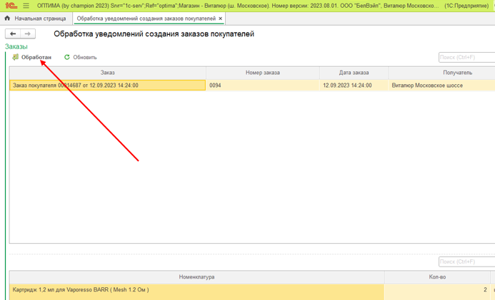3. В окне заказов сразу нажимаем «Обработан»