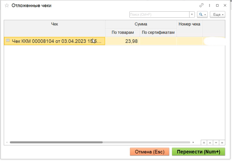 3. Выбираем нужный отложенный чек, нажимаем кнопку "Перенести".