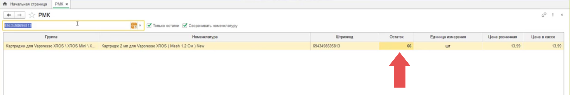 3. Пробиваем (пикаем) ШК любых товаров, в столбце "Остаток" отображается текущее кол-во в магазине