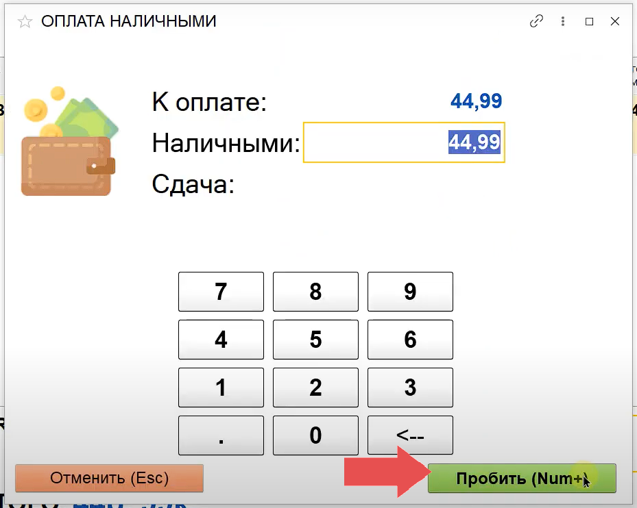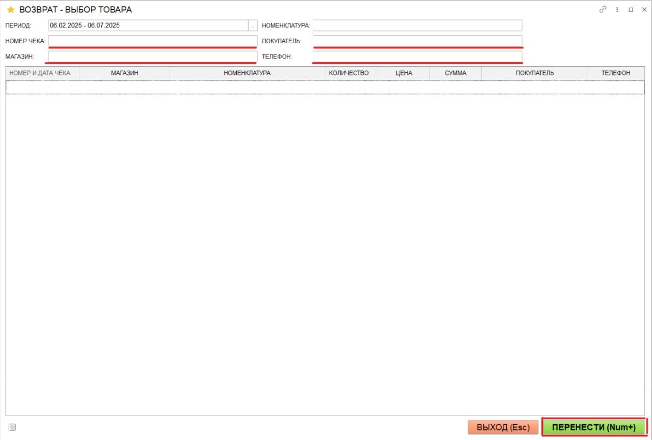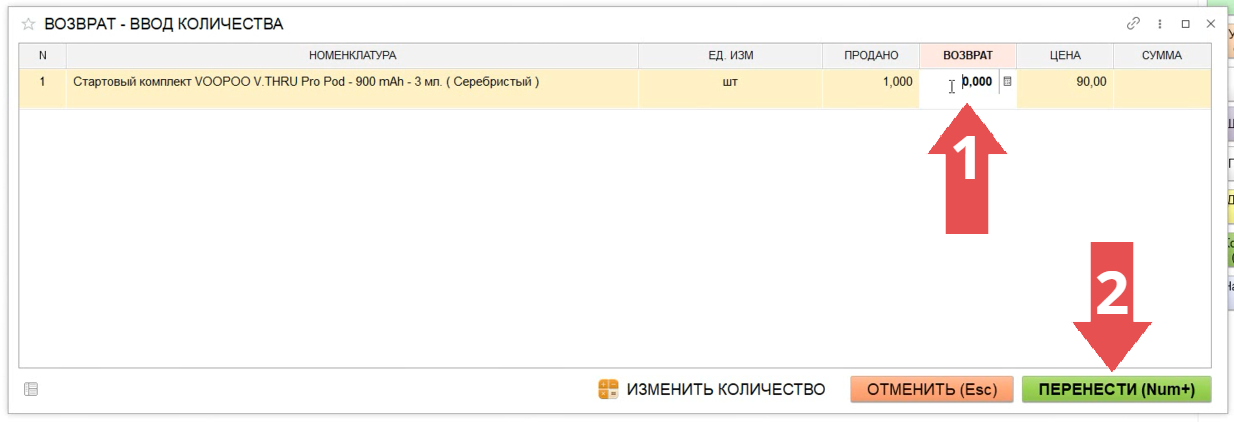 6. Открывается окно ввода количества. В столбике "Возврат" вводим 1 шт. возвращаемого товара и нажимаем "Перенести".
