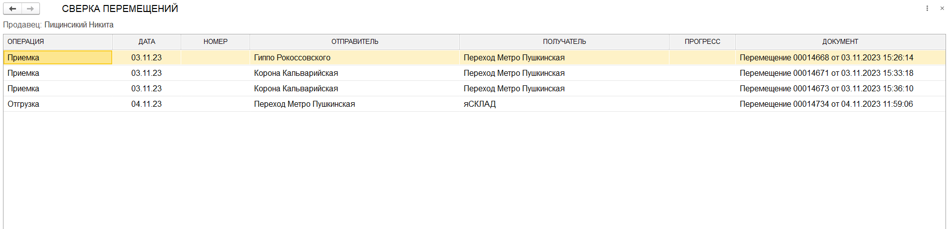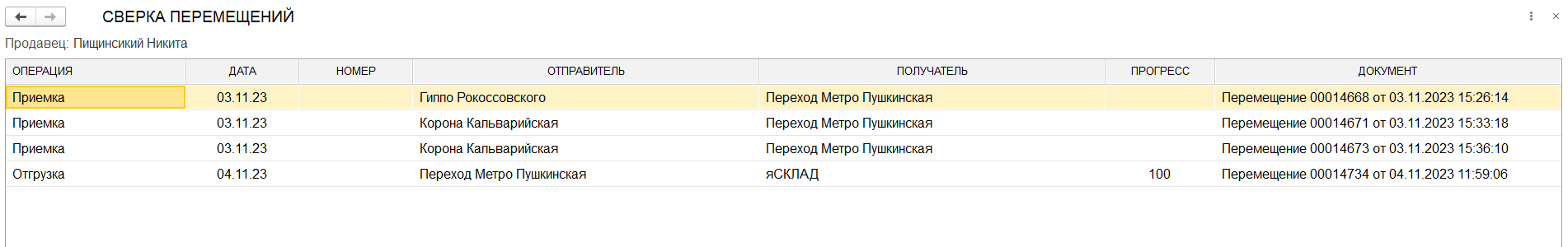 Также на форме списка перемещений прогресс сверенного перемещения измениться на значение 100