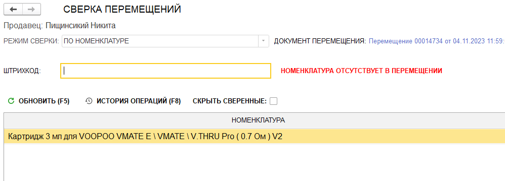 Если сканируется номенклатура, которая отсутствует в перемещении (или на рознице не хватает остатка для зачисления), то появляется надпись «Номенклатура отсутствует в перемещении» вместе со звуковым уведомлением: