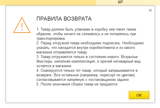 5. Открываем перемещение с видом операции «Отгрузка» и сразу открывается информационное окно с правилами текущего возврата: